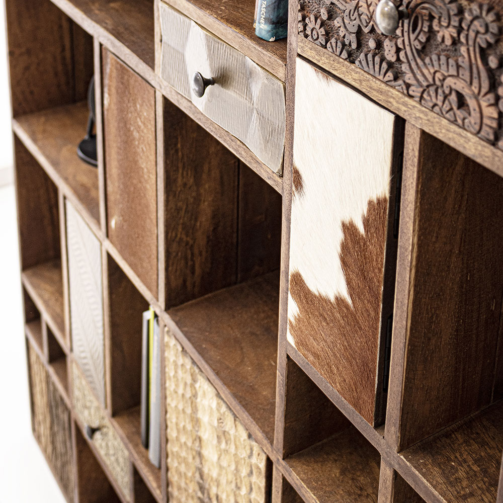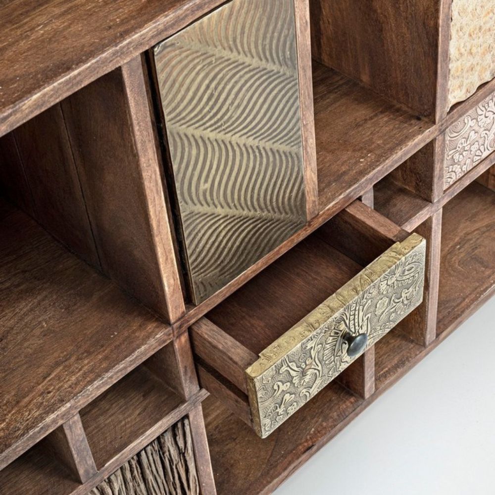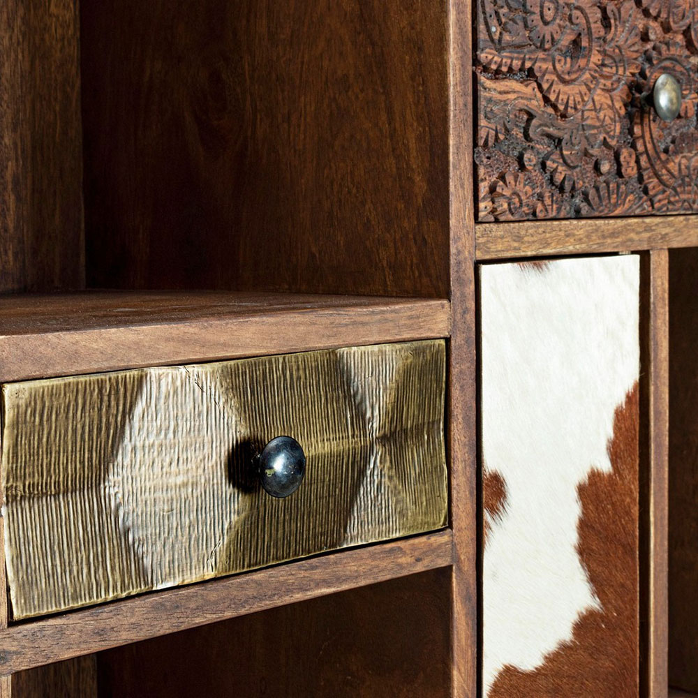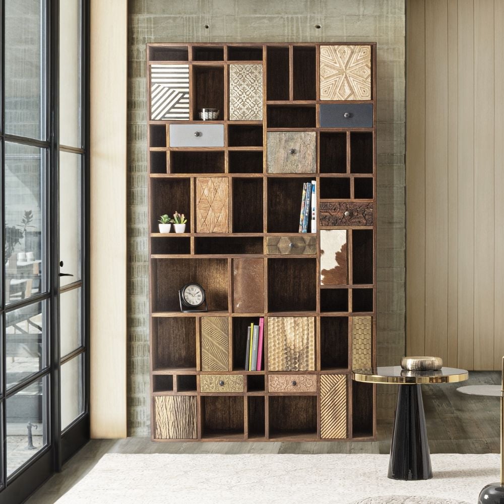 Adepte de l’aspect récup’, craquez pour la bibliothèque DHAVAL. Riche en cases de toutes tailles, en portes et tiroirs qui détonnent, elle apportera du cachet façon bois recyclé et singularité à votre pièce, tout en vous donnant loisir d’y ranger livres et bibelots favoris.