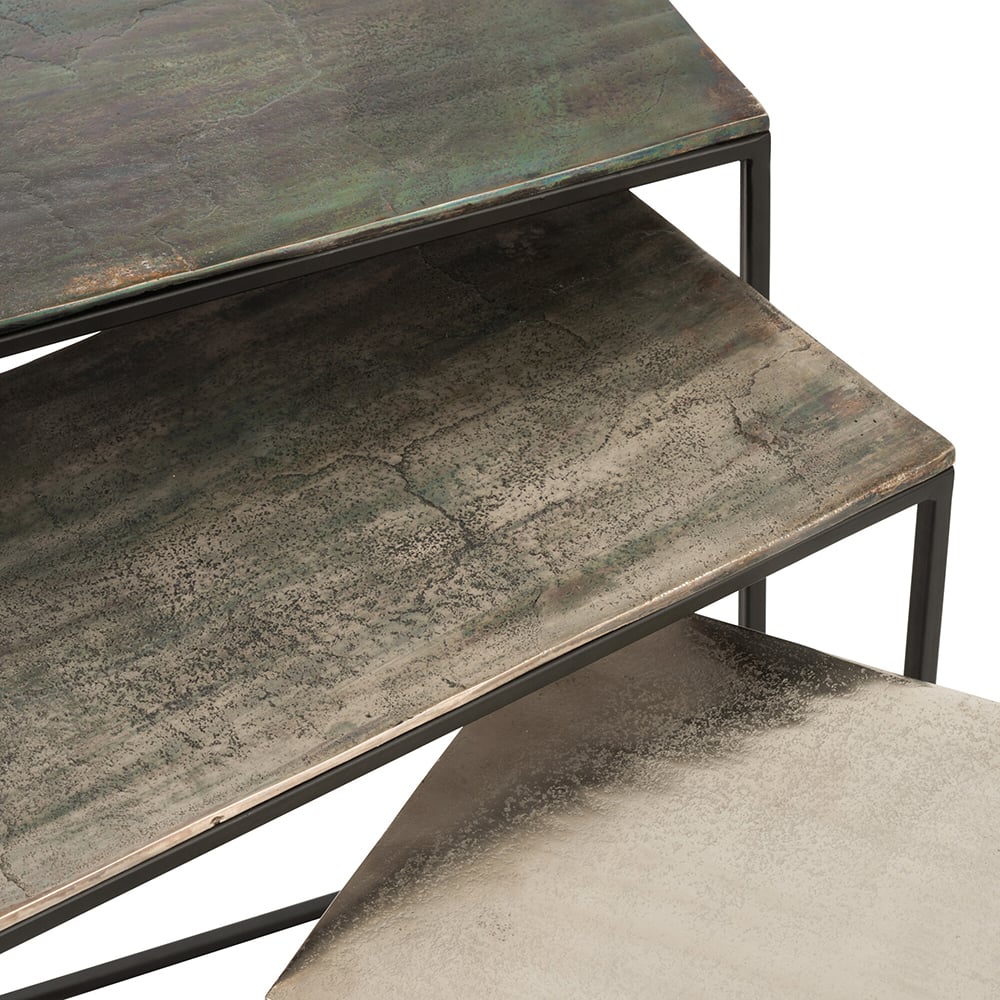 Structures et plateaux en aluminium – Coloris noir/vert, or antique, or – Dimensions de la plus grande table à la plus petite : L.53 x H.66 x P.29 cm || L.48 x H.60 x P.26 cm || L.43 x H.55 x P.24 cm