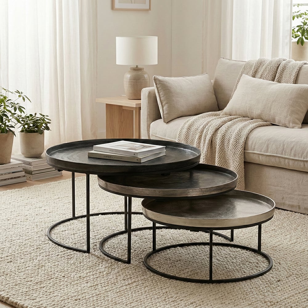 Craquez pour le design épuré de ce lot de 3 tables gigognes rondes en aluminium ! Dépliables selon vos envies, elles allient praticité et style pour une ambiance chic et moderne.