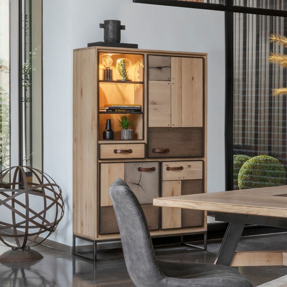 Complet et reflet d’un travail du bois minutieux, le meuble de rangement PAULINE propose une diversité de rangement entre portes, tiroir et tablettes dans un ensemble d’éléments en chêne massif organisés en rectangles et carrés, agrémentés de poignées en cuir, et d’encadrements en métal. Une identité forte pour un meuble rangement séjour moderne au style remarquable.