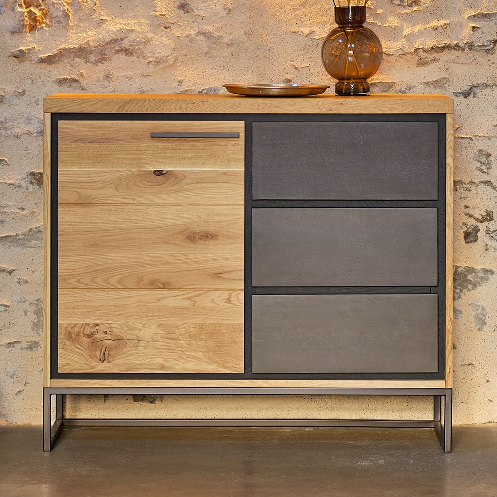 Tout mignon, le petit meuble d’entrée BRUYERES a tout d’un grand ! Composé de 2 portes et un tiroir, il conviendra à votre intérieur si vous souhaitez créer de la chaleur accueillante dès votre entrée. En chêne massif, garant d’authenticité, il se marie avec un aspect béton et des pieds en métal pour une touche esthétique, moderne et résolument indus.