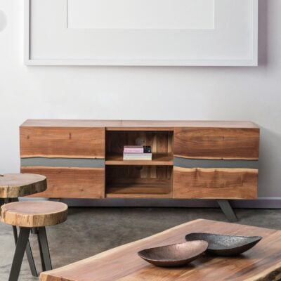 Structure en bois de manguier et acier, dos en contreplaqué – Côté, devant, volets et tiroirs en bois recyclé ou feuille d’acier ou finition en fibre-ciment – Finition acrylique de protection.