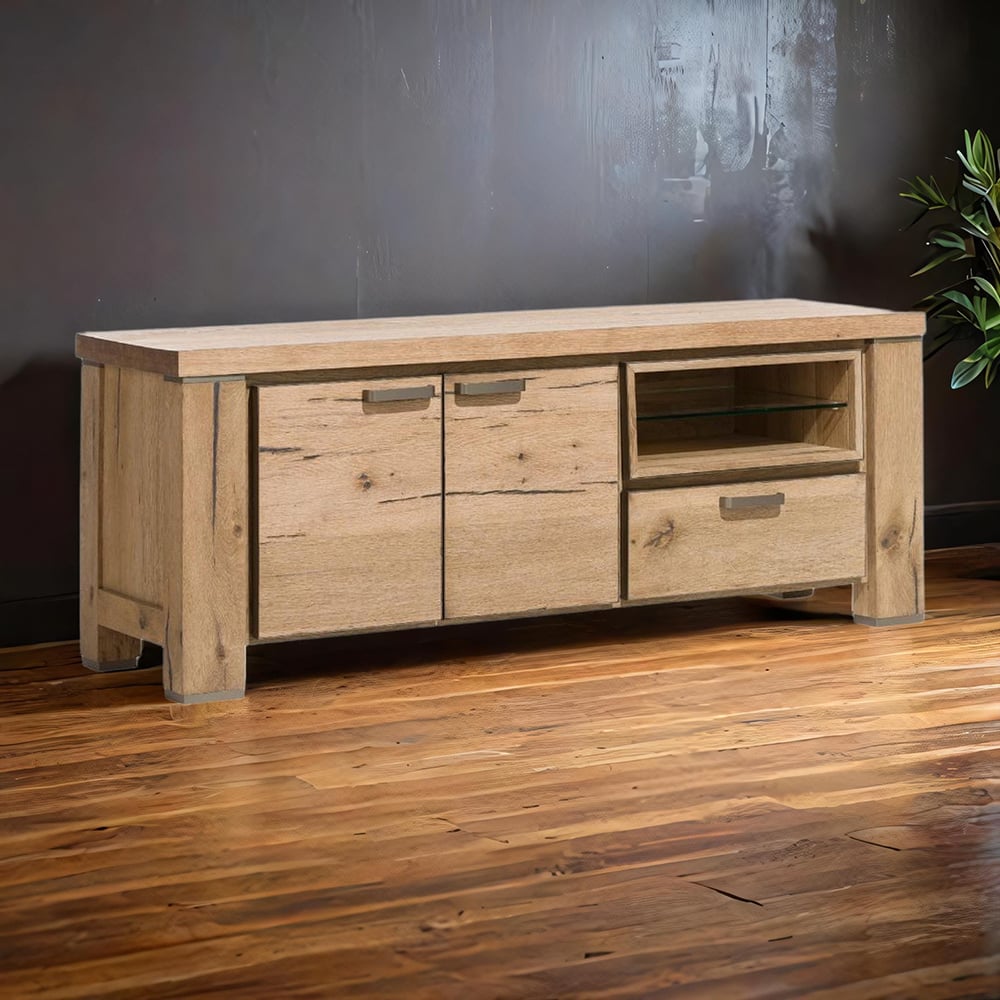 Actuel et chaleureux, le meuble TV CAMBRIDGE est composé de 2 portes, 1 tiroir et une niche avec étagère en verre réhaussée d’un éclairage led. Avec ses poignées et pieds en métal, il apporte une touche contemporaine à son ensemble. Existe en 3 longueurs pour toutes les tailles de salon : 130 cm, 160 cm et 190 cm.