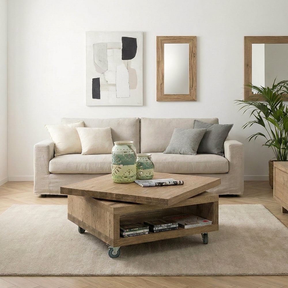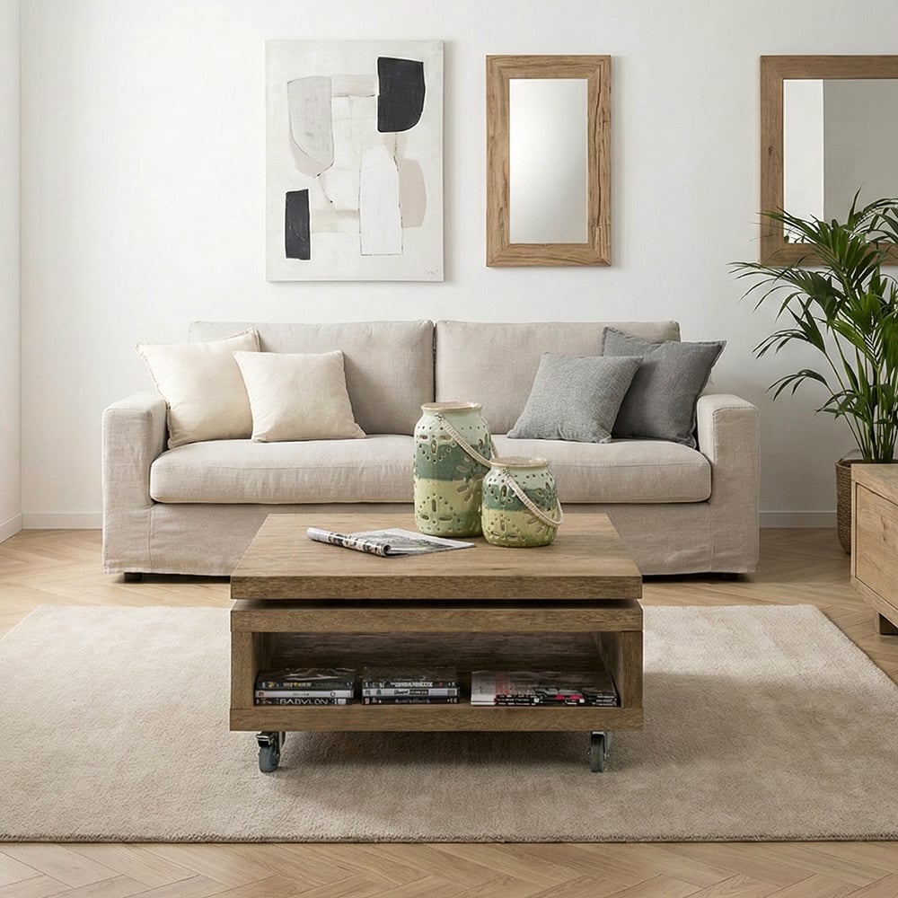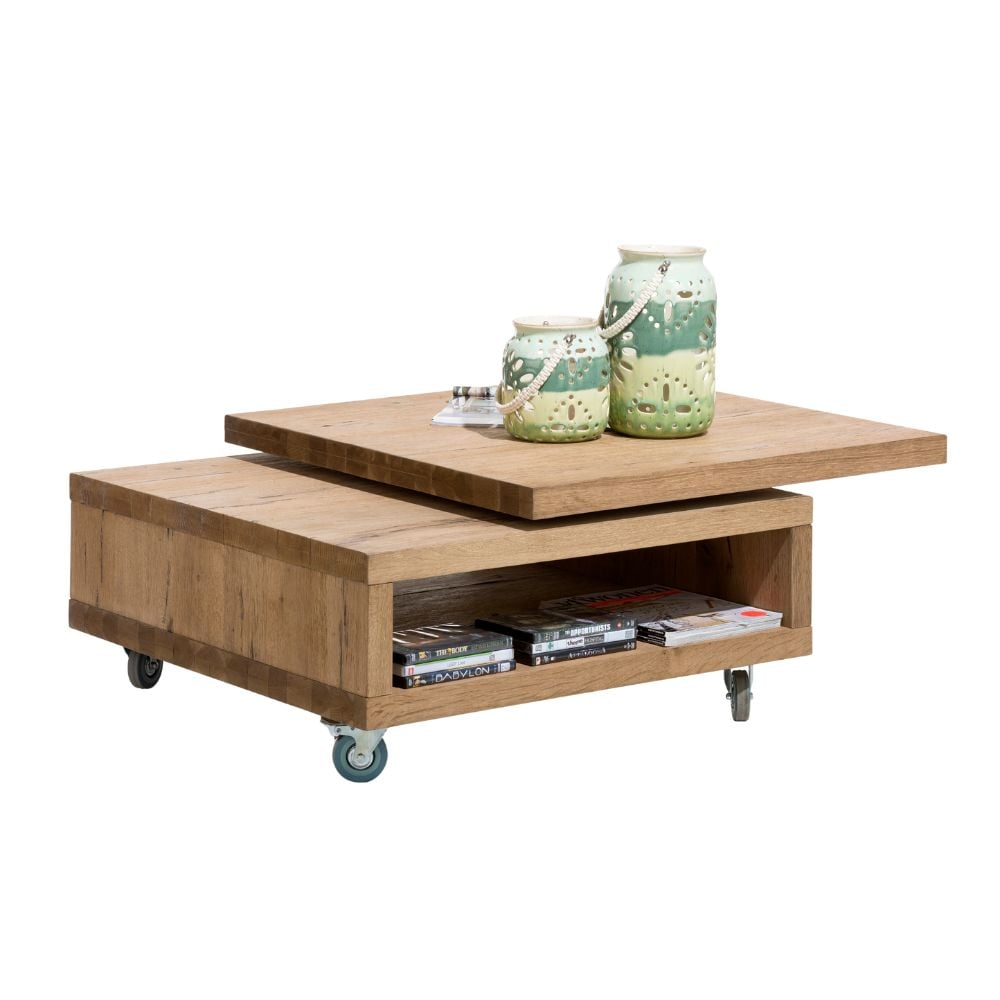 À la page, mobile et pratique, la table basse CAMBRIDGE a tout pour plaire ! Carrée et sur roulettes dotées de freins, vous pourrez compter sur elle pour servir à toutes occasions dans votre salon. Composée de bois de chêne, son ingéniosité réside dans son plateau pivotant et coulissant, et dans sa niche latérale, pour configurer et ranger simplement selon vos envies.