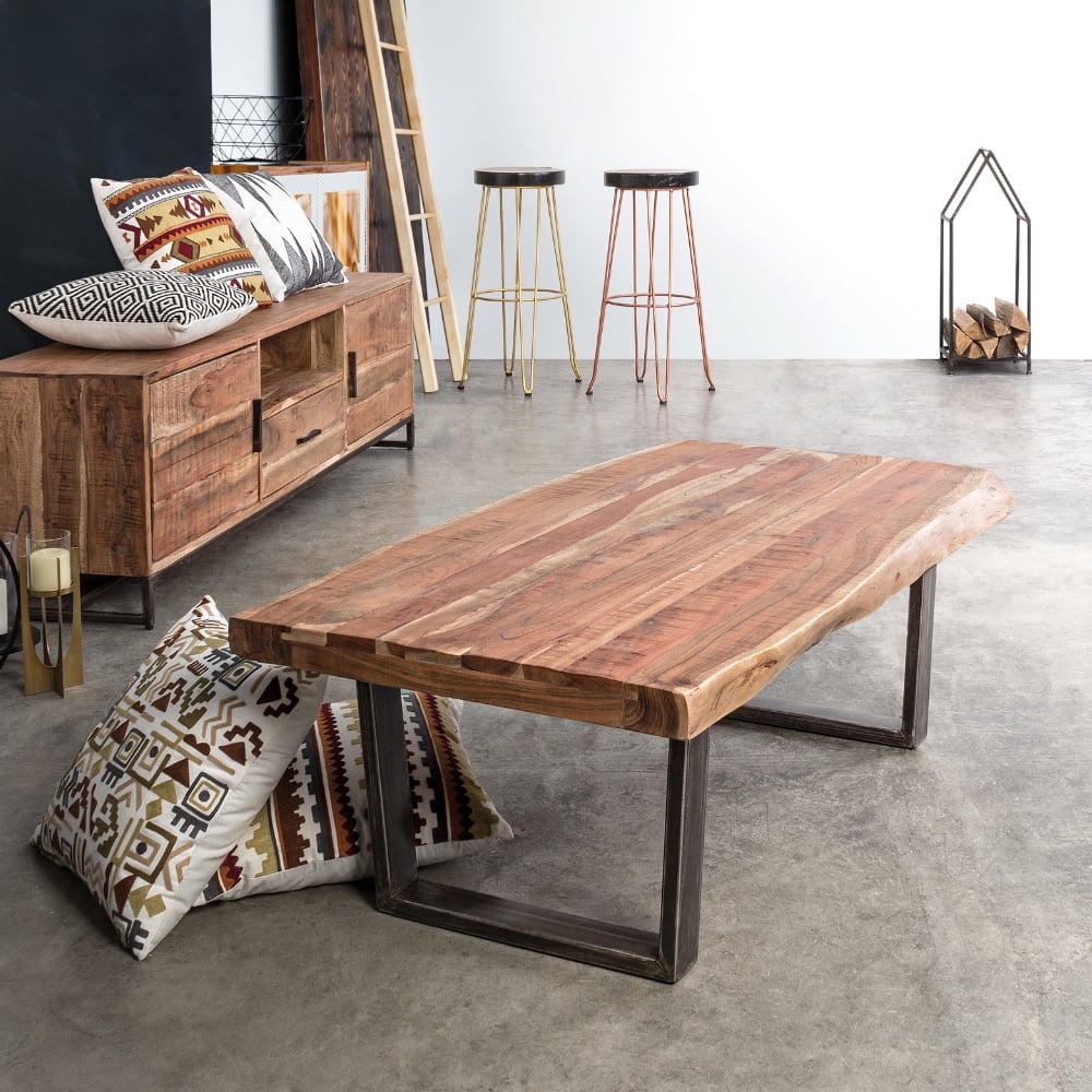 Table basse 120×70 cm – Pieds en fer à assembler – Plateau en bois d’acacia (sections originales du tronc) – Finition acrylique de protection – S’agissant d’un plateau fait main, les formes et les dimensions sont indicatives – Chaque table est unique car provient d’un arbre différent dont le veinage et la forme lui sont propres.